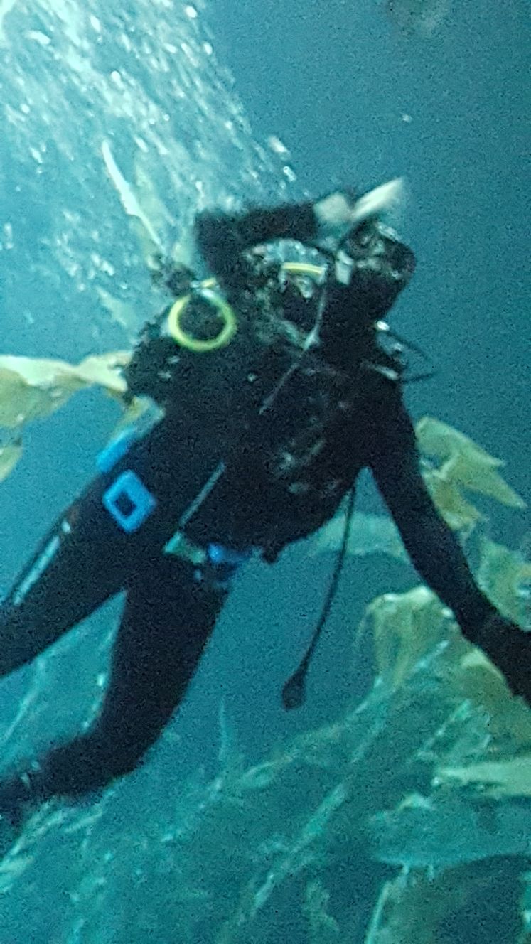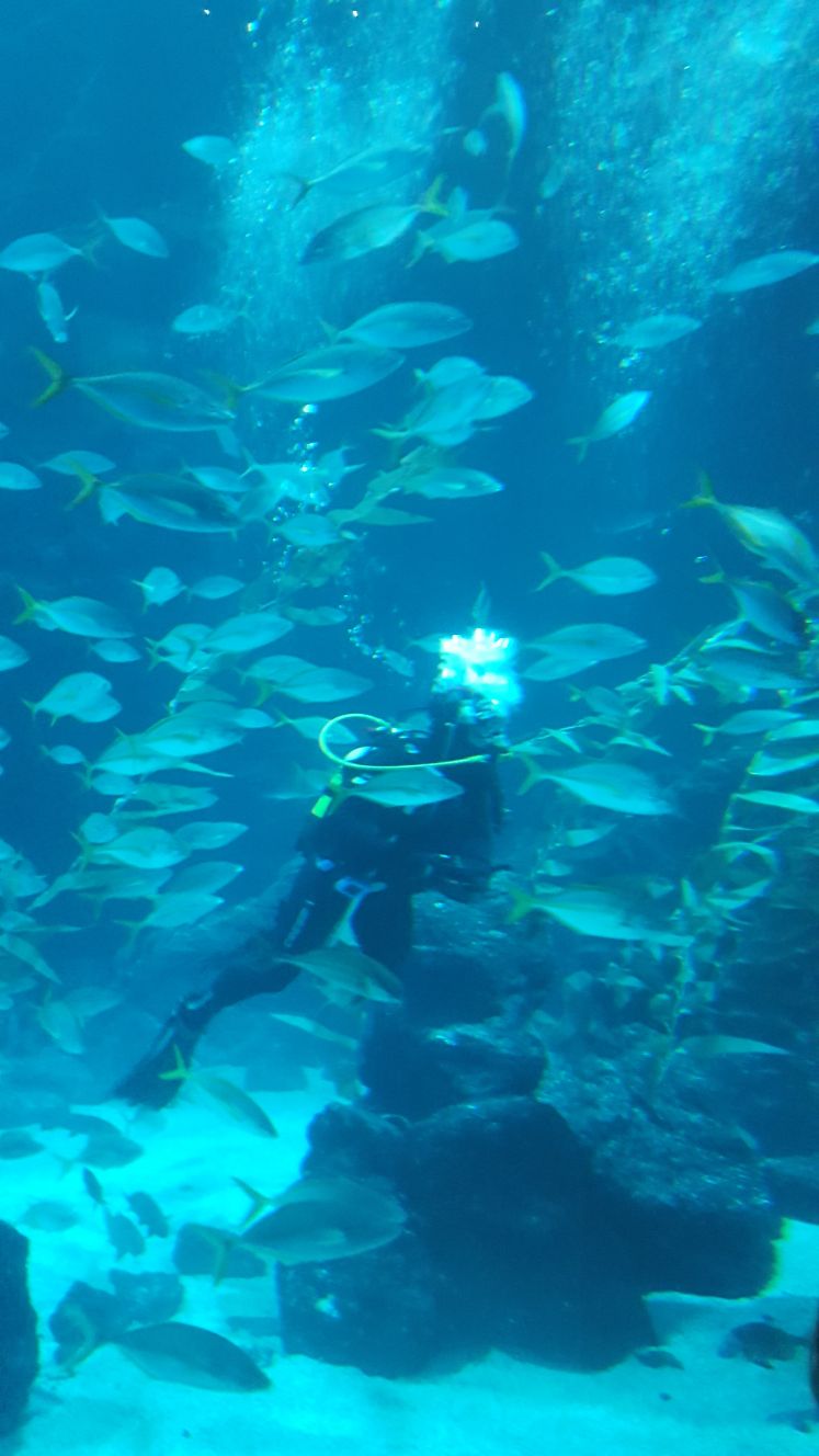 Buzo en el acuario de Poema del Mar buceando en autónomo. Los buzos no puden operar en autónomo si realizan una tarea de mantenimiento o reparación.