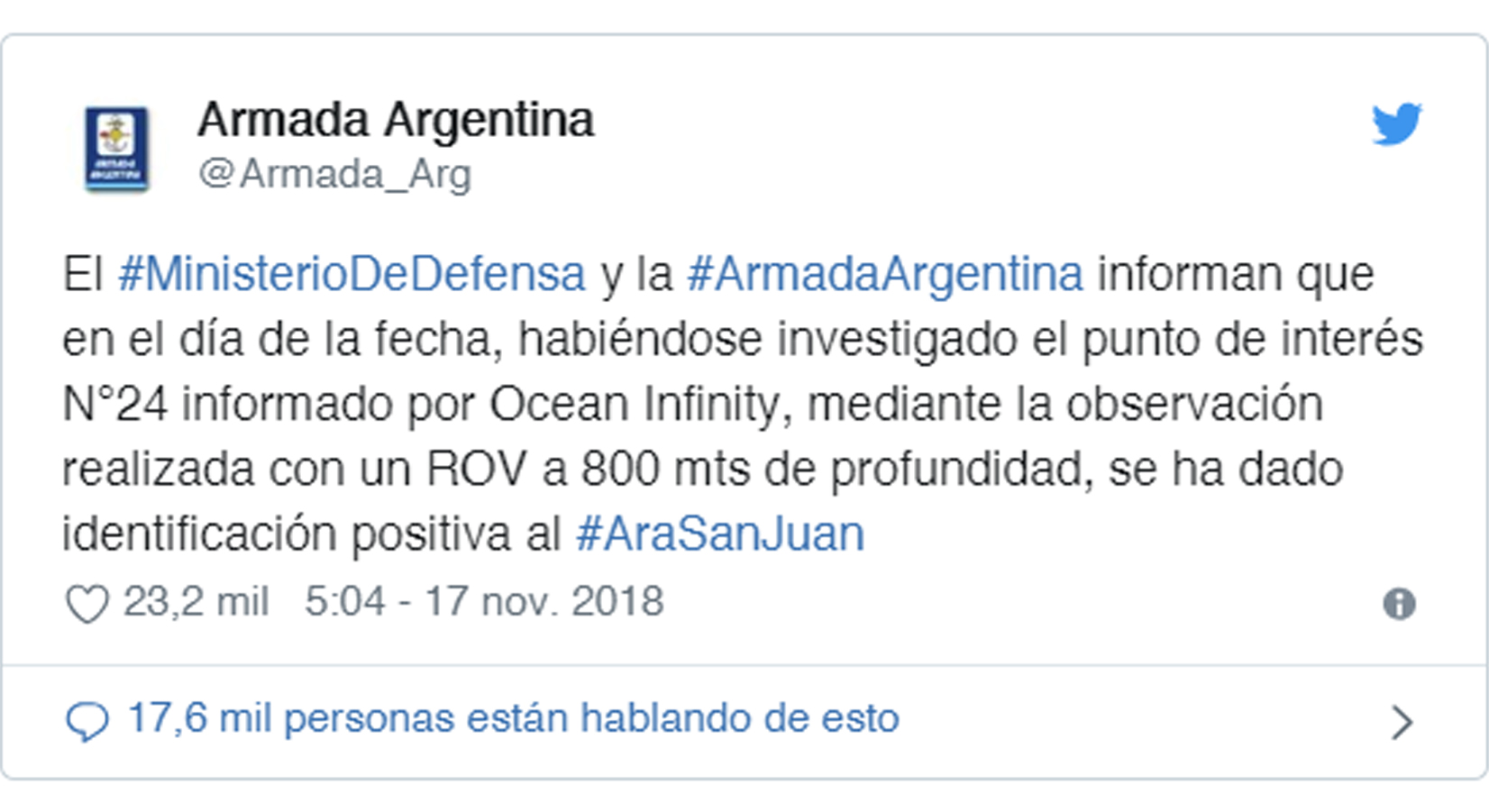 “Se ha dado identificación positiva al Ara San Juan”. Con esta frase, el Ministerio de Defensa y la Armada argentina han puesto fin al año y un día de la misteriosa desaparición del submarino con 44 tripulantes a bordo. El buque estadounidense Seabed Constructor, con la ayuda de un minisubmarino, lo encontró a 800 metros de profundidad en la noche del viernes (la madrugada del sábado en España).
