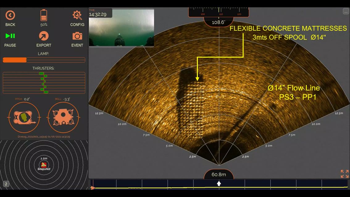 Para cumplir con garantías con el proyecto, la compañía movilizó el buque de apoyo ‘Armada Tuah 84′, una embarcación tipo AHTS equipado con un sistema de posicionamiento dinámico DP2 y diseñado, entre otras cuestiones, para operar con vehículo de control remoto (ROV). En este caso, el dron submarino elegido fue un vehículo Oceanbotics SRV-8, equipado con elementos de alta precisión.
