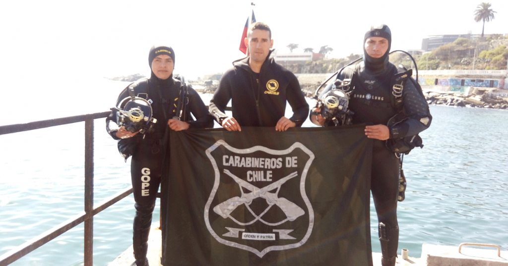 Patricio Galaz, Daniel Araos y Claudio Troncoso, buzos del GOPE y especialistas en rescates en medio terrestre y acuático, entre otras operaciones tácticas policiales, fueron los encargados de hacer el homenaje a los Carabineros chilenos. El trío de profesionales subacuáticos realizaron la inmersión con una bandera del escudo del cuerpo.