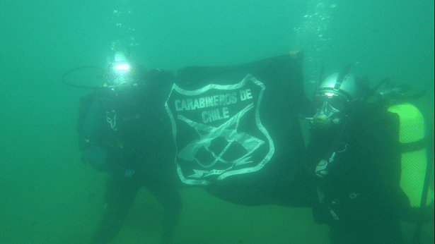 Patricio Galaz, Daniel Araos y Claudio Troncoso, buzos del GOPE y especialistas en rescates en medio terrestre y acuático, entre otras operaciones tácticas policiales, fueron los encargados de hacer el homenaje a los Carabineros chilenos. El trío de profesionales subacuáticos realizaron la inmersión con una bandera del escudo del cuerpo.