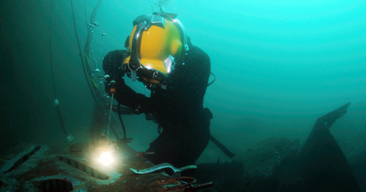 Buzo soldando bajo el mar. Foto de recurso Underwater W.)