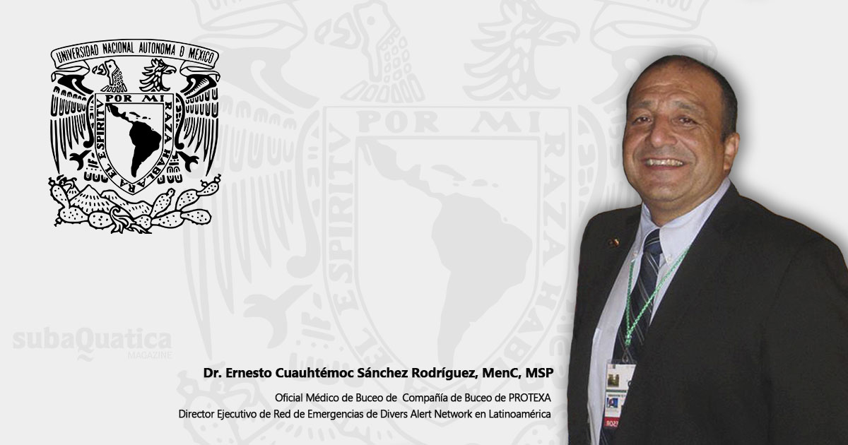 Ernesto Cuauhtémoc Sánchez es Director Ejecutivo de Red de Emergencias de Divers Alert Network en Latinoamérica y toda una eminencia en materia de medicina hiperbárica. Ha sido buzo comercial y es Oficial Médico de Buceo de Compañía de Buceo de PROTEXA. En definitiva, conoce el sector a la perfección.